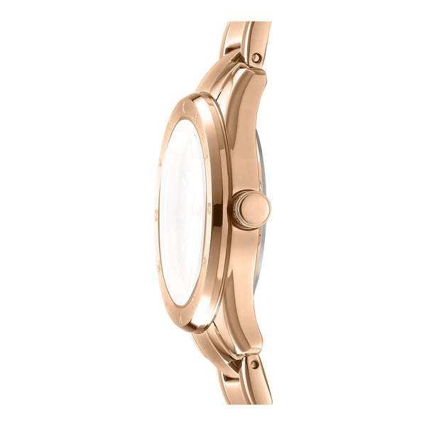 Nel cuore dell'eleganza urbana, dove la moda incontra la funzionalità, emerge un orologio che incarna lo spirito della sofisticazione moderna. Realizzato nel vibrante mondo di DKNY, l'orologio DK1L018 Chambers Sport è una testimonianza dell'impegno del marchio per lo stile e la precisione. Con la sua affascinante cassa rotonda, immersa nel caldo bagliore dell'oro rosa, questo orologio cattura l'essenza della femminilità contemporanea. Il diametro della cassa di 30 mm offre un perfetto equilibrio tra discrezione e impatto, rendendolo un compagno ideale per la donna attenta alla moda. Il quadrante in cristallo minerale protegge un quadrante che riflette la tonalità dell'oro rosa della cassa, creando un'estetica senza soluzione di continuità e lussuosa. Il cinturino in acciaio inossidabile, anch'esso in oro rosa, avvolge elegantemente il polso, fissato da una fibbia deployante a farfalla con pulsante per facilità e comfort. Resistente all'acqua fino a 50 metri, questo orologio è tanto pratico quanto bello, pronto ad accompagnarti nelle avventure della vita. Il movimento al quarzo garantisce precisione, mentre il display a tre lancette offre un tocco classico a questo capolavoro moderno. Che tu stia attraversando le strade affollate della città o partecipando a una soirée chic, l'orologio DK1L018 Chambers Sport è il tuo partner perfetto, emanando un'aria di design raffinato e fascino senza tempo.