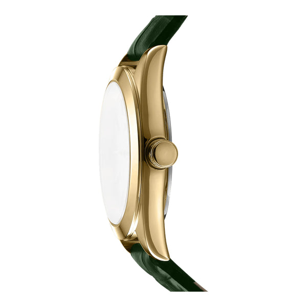 Nel cuore dell'eleganza urbana, l'orologio DKNY Nolita Midi emerge come un faro di stile sofisticato. Realizzato con un design raffinato, questo orologio cattura l'essenza della moda moderna con la sua cassa rotonda in oro giallo che brilla con un fascino sottile ma sorprendente. Con un diametro delicato di 32 mm, si posa con grazia sul polso, rendendolo l'accessorio perfetto per la donna contemporanea che apprezza sia la forma che la funzione. Il cinturino in pelle verde bottiglia, fissato con una classica fibbia ad ardiglione, aggiunge un tocco di eleganza ispirata alla natura, contrastando magnificamente con il quadrante grigio-argento. Questa armoniosa combinazione di colori evoca un senso di chic senza tempo, mentre il cristallo minerale garantisce durata e chiarezza. Con una resistenza all'acqua fino a 50 metri, questo orologio è tanto pratico quanto elegante, pronto ad accompagnarti nelle avventure della vita. Il movimento al quarzo garantisce precisione, mentre il display a tre lancette offre un aspetto pulito e ordinato. L'orologio DKNY Nolita Midi non è solo un orologio, è una dichiarazione di pensiero all'avanguardia nella moda, perfetto per chi apprezza le cose più raffinate della vita.