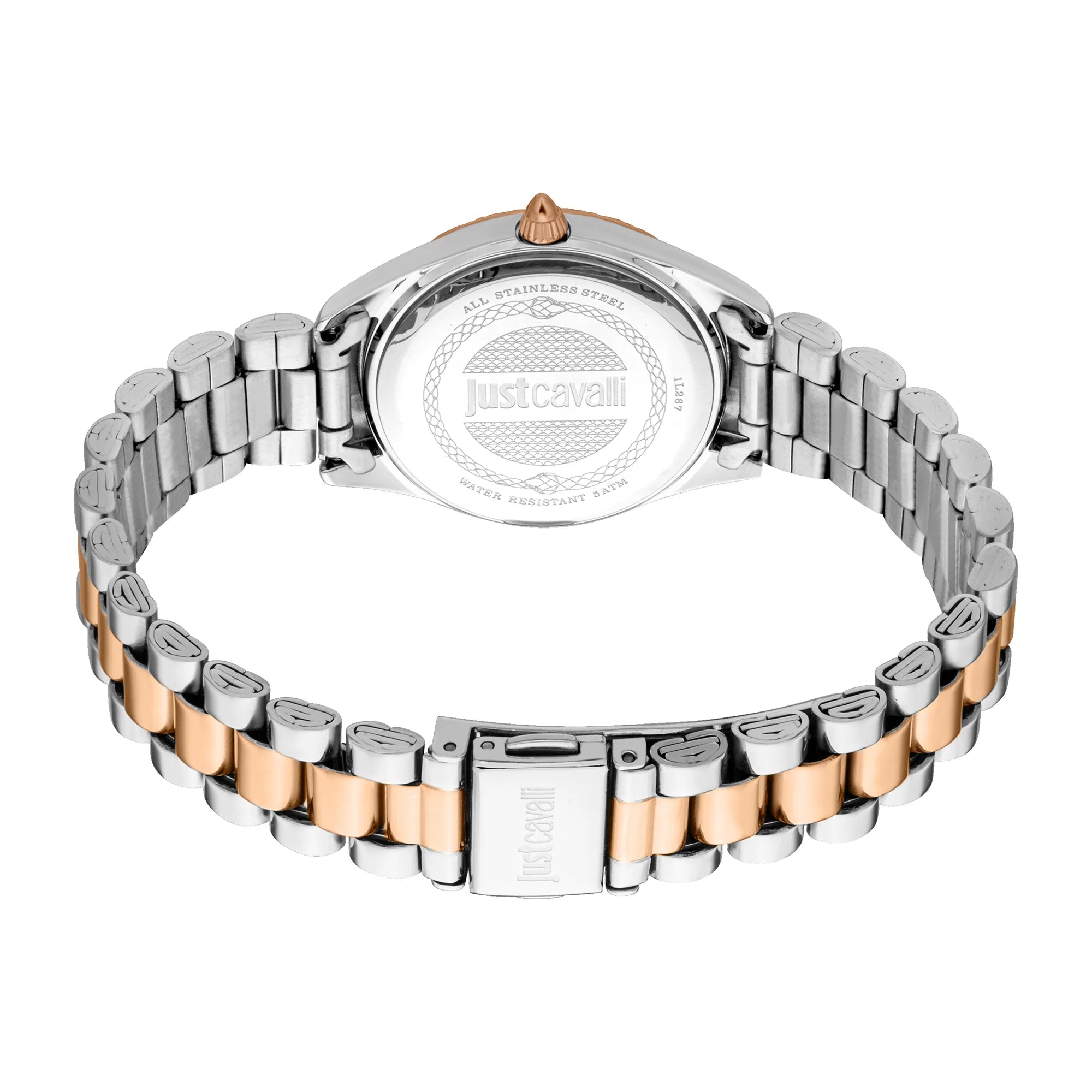 Abbraccia il fascino dell'eleganza italiana con il Just Cavalli Pacentro. Questo orologio all'avanguardia, realizzato in una scintillante tonalità oro rosa, presenta una cassa rotonda da 30 mm e un quadrante grigio-argento. Il suo cinturino in acciaio inossidabile, fissato con una chiusura deployante a farfalla, garantisce una vestibilità perfetta, mentre la resistenza all'acqua fino a 50 metri aggiunge un tocco di praticità al suo design raffinato.