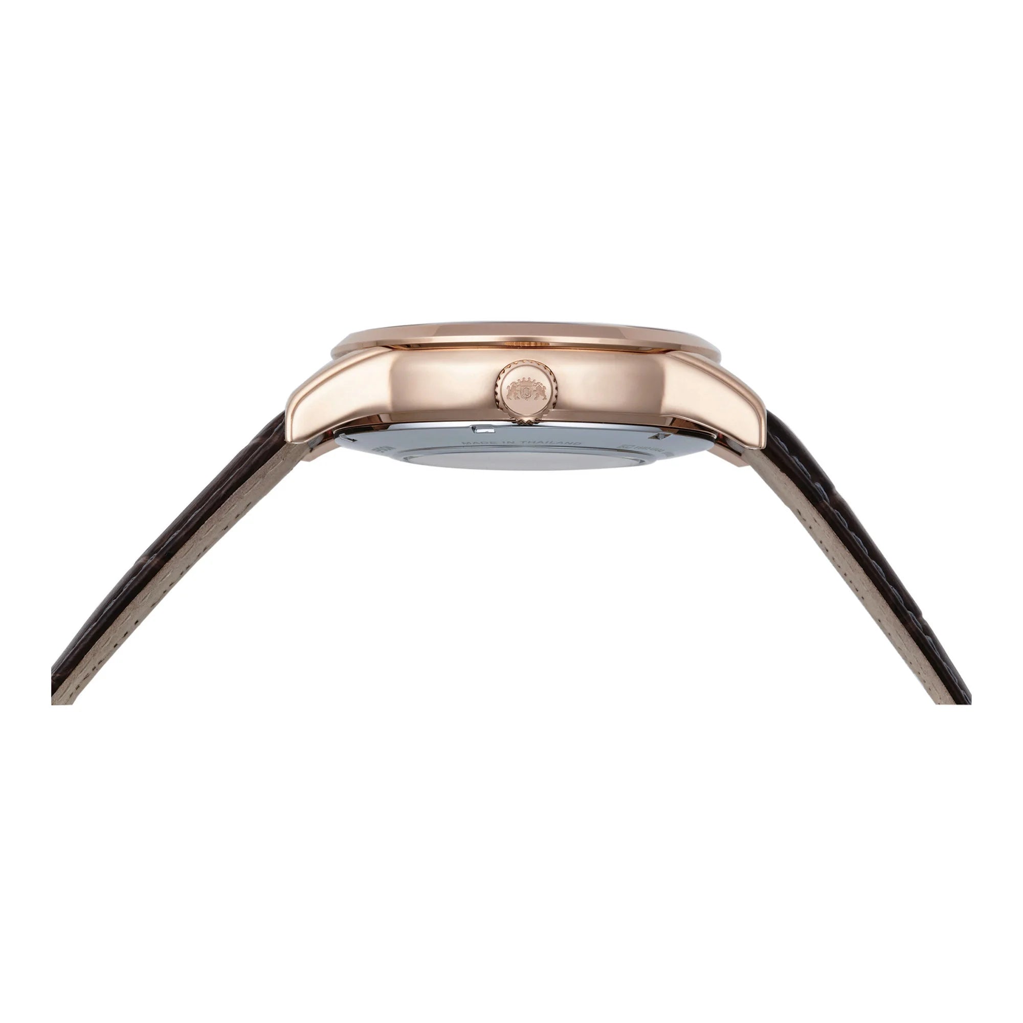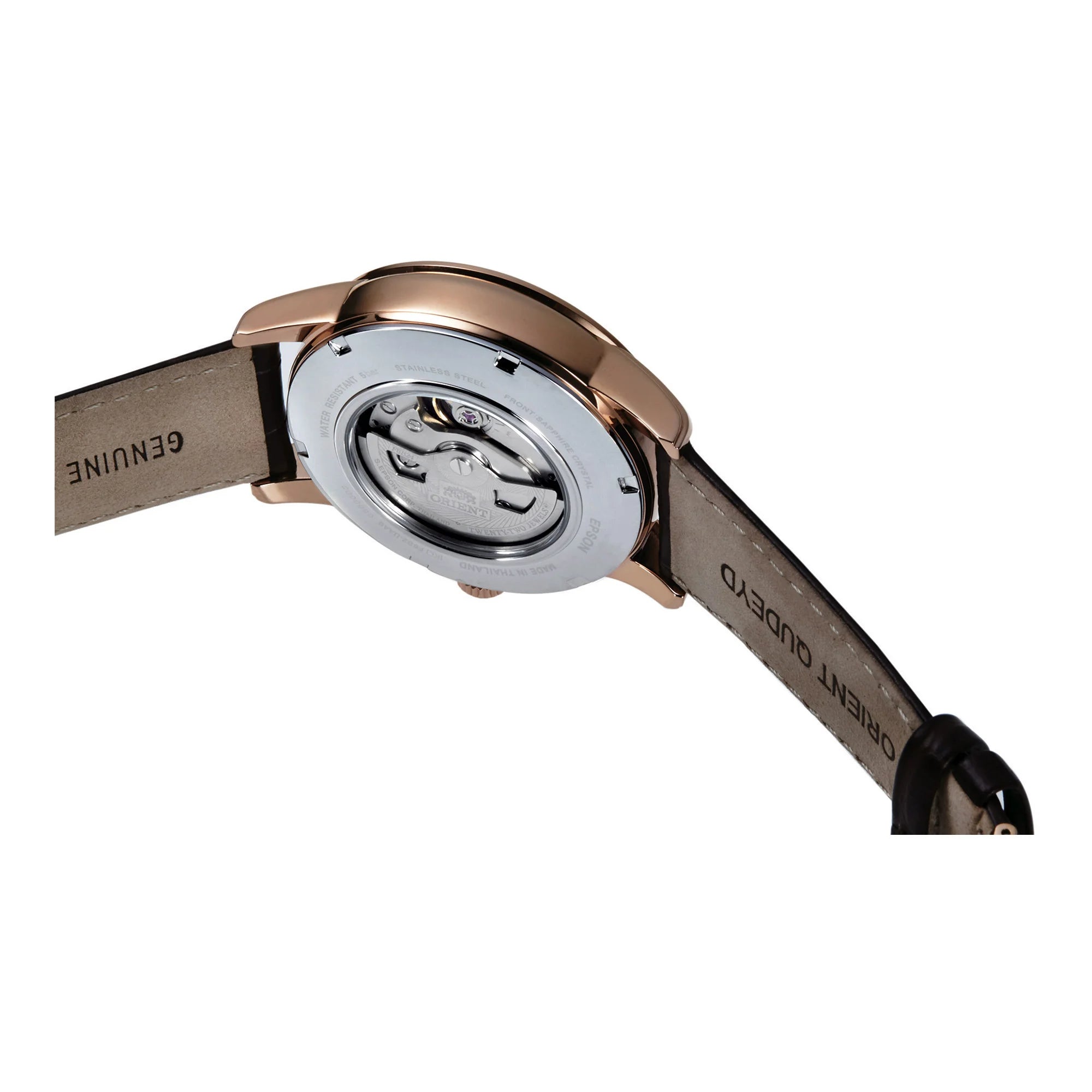 Nel regno dell'orologeria, dove gli orologi non sono semplicemente strumenti ma narratori di storie, l'ORIENT Classic AK00 Sun & Moon emerge come una testimonianza di eleganza senza tempo e maestria meccanica. Realizzato nel cuore dell'ingegneria di precisione, questo orologio incarna la perfetta fusione tra tradizione e innovazione. La sua cassa rotonda, immersa nel caldo bagliore dell'oro rosa, cattura lo sguardo con una presenza sottile ma autorevole. Con un diametro di 42 mm, raggiunge un equilibrio armonioso tra audacia e raffinatezza, rendendolo un compagno ideale per il gentiluomo esigente. Il quadrante marrone cioccolato, che ricorda un ricco e vellutato cacao, funge da tela per la danza intricata del tempo, con tre lancette che scorrono con grazia sulla sua superficie. La complicazione del calendario con giorno e data aggiunge un livello di praticità, perfettamente integrato nel design. Sotto il cristallo zaffiro, il cuore dell'orologio batte con la precisione del calibro F6B24, una meraviglia meccanica con 22 rubini. Questo movimento, sia a carica manuale che automatica, garantisce che il tempo venga mantenuto con una precisione di +25/-15 secondi al giorno. Il fondello trasparente offre uno sguardo sul funzionamento intricato, un promemoria dell'artigianalità che si cela all'interno. Avvolgendo il polso con un cinturino in pelle marrone cioccolato, l'orologio è fissato con una fibbia déployante pieghevole, offrendo sia comfort che sicurezza. Con una resistenza all'acqua di 50 metri, è tanto versatile quanto elegante, pronto ad accompagnare chi lo indossa dalle riunioni in sala conferenze alle serate mondane. L'ORIENT Classic AK00 Sun & Moon non è solo un orologio, è una celebrazione del tempo stesso, un pezzo che sussurra storie di eredità e innovazione a ogni ticchettio.