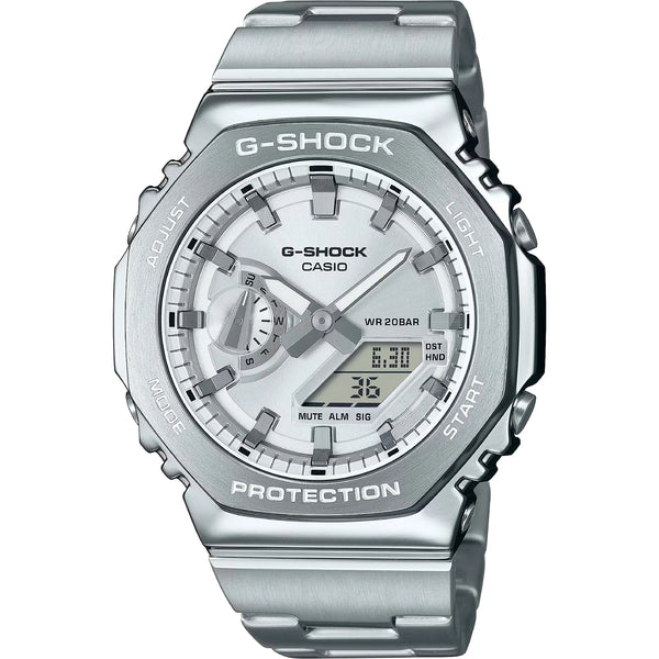 Nel regno della misurazione del tempo, dove la precisione incontra la resilienza, emerge un capolavoro che sfida l'ordinario. Realizzato nello spirito dell'avventura, questo Casio G-Shock è una testimonianza dello spirito indomabile dell'esploratore moderno. La sua cassa esagonale, immersa in un elegante grigio argento, emana un design raffinato che è allo stesso tempo audace e sofisticato. Con un diametro della cassa di 44mm, attira l'attenzione senza sovrastare il polso, rendendolo il compagno perfetto per chi naviga sia nelle giungle urbane che nelle terre selvagge incontaminate. Il cinturino in acciaio inossidabile, che riflette la tonalità grigio argento della cassa, avvolge il polso con un senso di scopo, offrendo durata e stile in egual misura. Sotto il cristallo minerale, il quadrante continua il tema monocromatico, creando una fusione perfetta tra forma e funzione. Questo orologio non è solo un segnatempo, è uno strumento per l'avventuriero moderno. Con una resistenza all'acqua da sub di 200 metri, ti sfida a esplorare le profondità, mentre il movimento al quarzo garantisce un'accuratezza incrollabile. Il display digitale, alimentato dal calibro 5611, offre un calendario completo che traccia giorno, data, mese e anno, assicurandoti di essere sempre sincronizzato con il mondo. Per chi esige di più, cronografo, allarme, timer e funzioni di ora mondiale sono a portata di mano, pronti ad assisterti in ogni impresa. E quando il sole tramonta, la luce integrata assicura che il tempo non vada mai perso nelle ombre. Questo Casio G-Shock è più di un accessorio, è una dichiarazione di forza e sofisticatezza, progettato per chi vive la vita secondo le proprie regole.