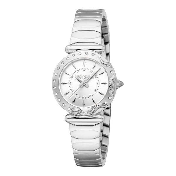 Il Just Cavalli Stella Snake in grigio argento è una sinfonia di stile e grazia. La sua cassa rotonda da 28mm e il quadrante abbinato creano un aspetto uniforme, mentre il cinturino in acciaio inossidabile e la resistenza all'acqua di 50m offrono sia bellezza che resistenza. Una vera dichiarazione di moda.