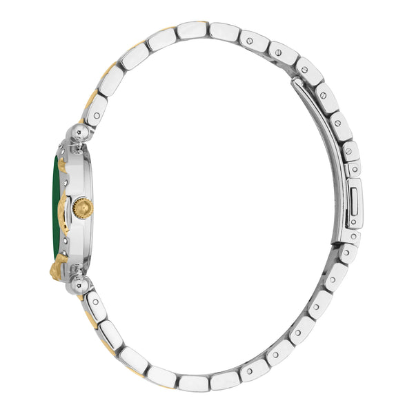 Immergiti nelle profondità dello stile con il Just Cavalli Stella Snake in oro giallo. La sua cassa da 28mm e il quadrante verde bottiglia evocano un senso di mistero, mentre il cinturino in acciaio inossidabile e la resistenza all'acqua di 50m garantiscono che sia pronto per ogni occasione.