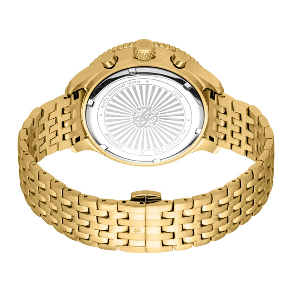 Goditi il bagliore dorato dell'orologio Roberto Cavalli Gent, dove una cassa in oro giallo e un quadrante nero creano un contrasto sorprendente. Il cinturino in acciaio inossidabile e la chiusura deployante a farfalla ne esaltano l'eleganza lussuosa, mentre la resistenza all'acqua fino a 100 metri garantisce un'eleganza senza tempo.