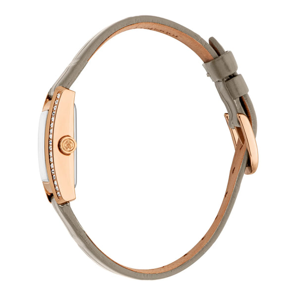 L'orologio da donna Roberto Cavalli in oro rosa è una visione di eleganza. La sua cassa rettangolare e il quadrante grigio argento sono splendidamente completati da un cinturino in pelle grigio chiaro, creando un'armoniosa fusione di stile moderno e grazia senza tempo.