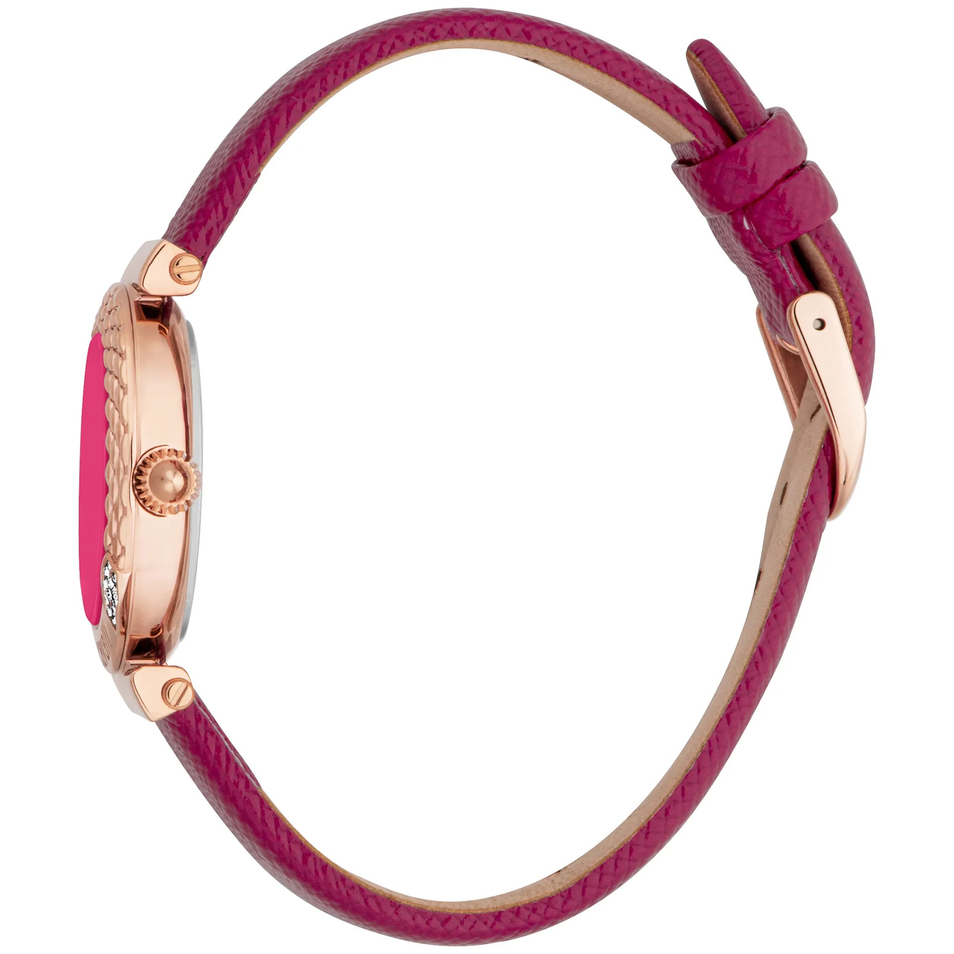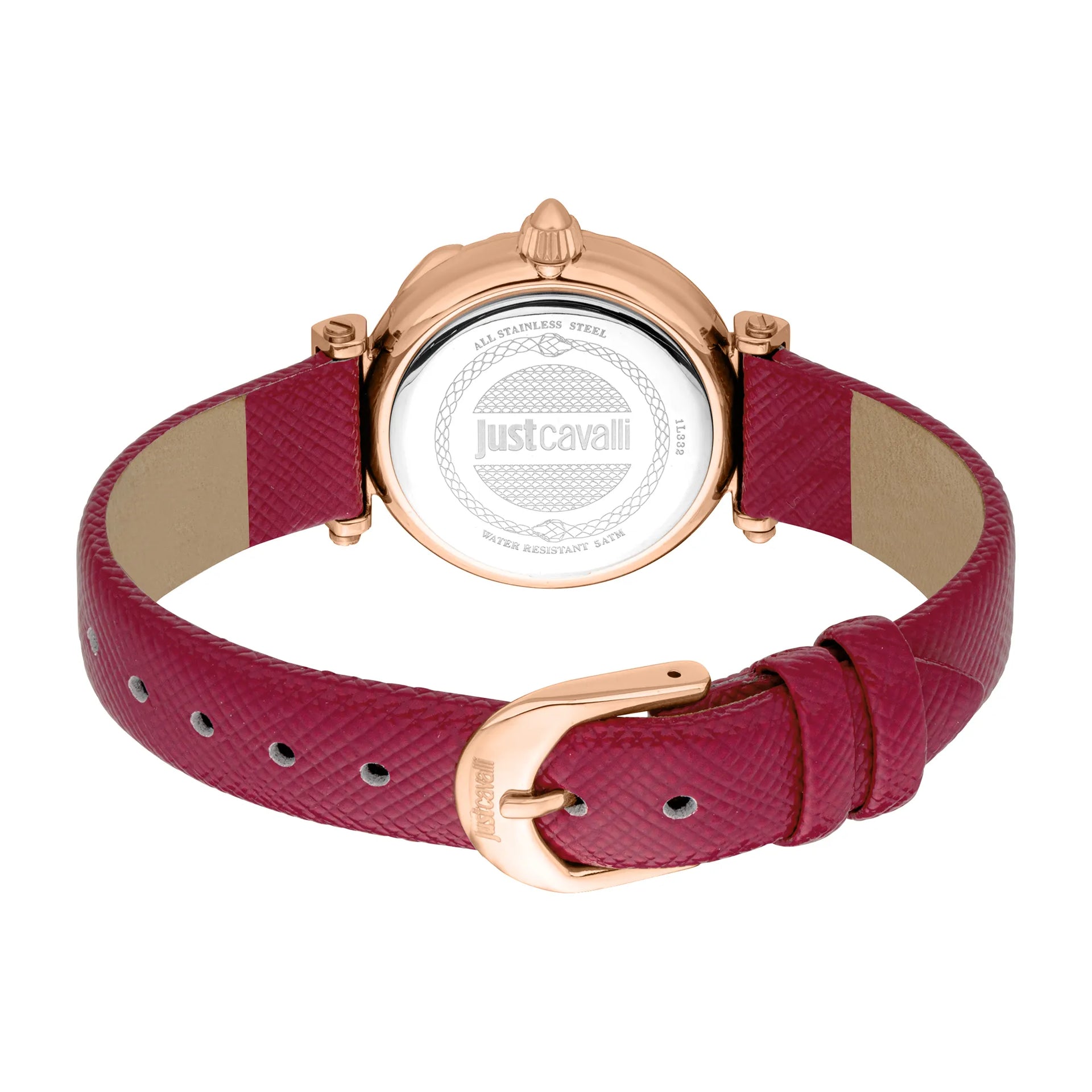 Il Just Cavalli Curiosa in oro rosa è un'espressione vibrante di stile. Con una cassa rotonda da 30 mm e un cinturino in pelle viola brughiera, questo orologio è sia audace che elegante. Il suo cristallo minerale e la resistenza all'acqua fino a 50 metri garantiscono che rimanga un accessorio affidabile, perfetto per chi osa distinguersi.