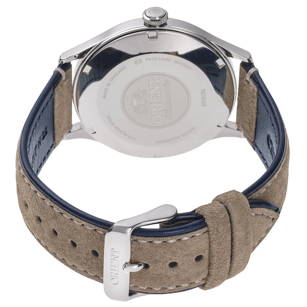 Nel regno dell'eleganza senza tempo, l'ORIENT AC0P Bambino V4 emerge come un faro di sofisticazione e stile. Realizzato con precisione, questo orologio ORIENT Classic è una testimonianza dell'arte dell'orologeria, progettato per l'uomo moderno che apprezza le cose più raffinate della vita. La sua cassa rotonda, immersa in una elegante tonalità grigio argento, misura un imponente diametro di 42 mm, emanando una presenza raffinata al polso. Il cristallo minerale protegge un quadrante blu notte ipnotico, che ricorda un cielo stellato, dove tre lancette scorrono con grazia sulla sua superficie, segnando il passare del tempo con eleganza senza sforzo. Il cinturino in pelle beige, fissato con una fibbia ad ardiglione, aggiunge un tocco di eleganza casual, rendendolo il compagno perfetto per ogni occasione. Sotto il suo squisito esterno si trova il cuore dell'orologio: un movimento meccanico alimentato dal calibro F6724, con 22 rubini e dotato di capacità sia manuali che automatiche. Con una precisione giornaliera di +25/-15, questo orologio garantisce precisione in ogni momento. La funzione calendario della data aggiunge praticità al suo fascino, mentre la corona a estrazione e spinta consente regolazioni facili. Resistente all'acqua, questo orologio è pronto ad accompagnarti nelle avventure della vita, che tu stia navigando nella giungla urbana o godendo di una giornata di relax vicino all'acqua. L'ORIENT AC0P Bambino V4 non è solo un orologio, è una dichiarazione di gusto raffinato e stile senza tempo, un vero compagno per il gentiluomo esigente che valorizza sia la forma che la funzione nella sua vita quotidiana.