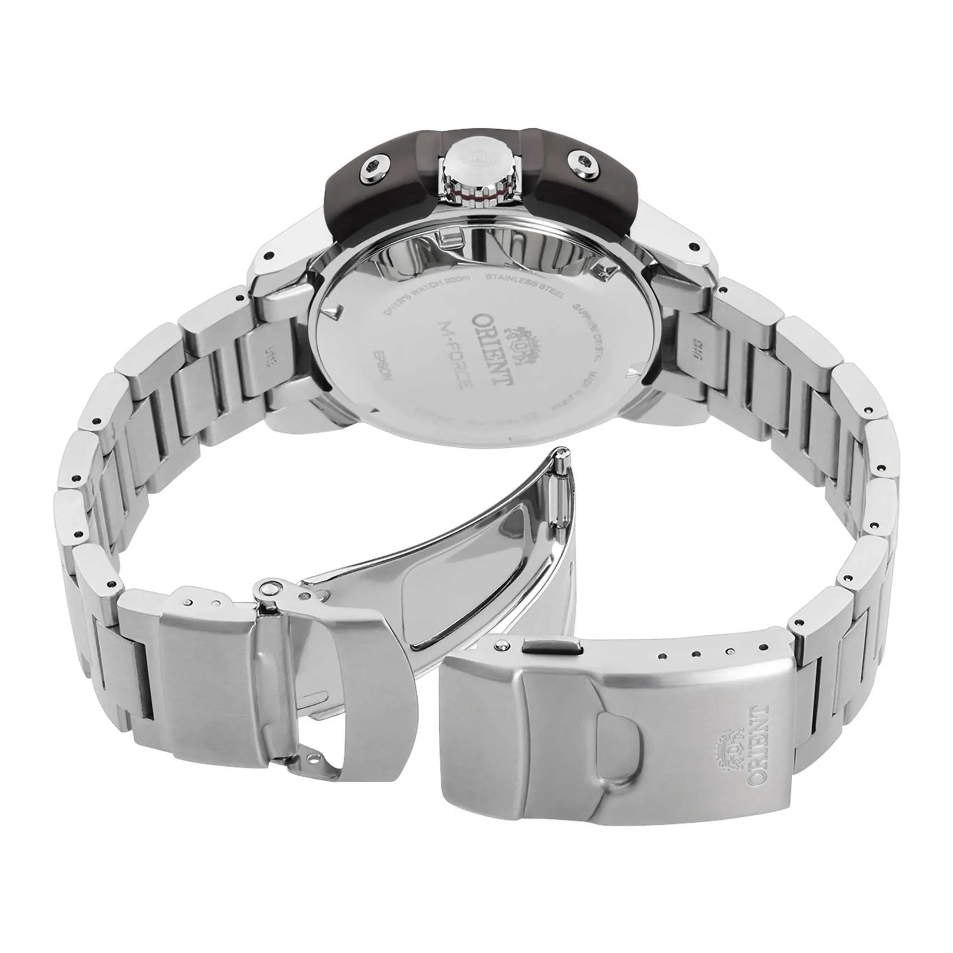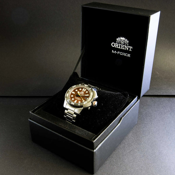 L'ORIENT M-Force, con il suo quadrante rosso acceso e la cassa grigio-argento, è progettato per chi osa distinguersi. La sua resistenza all'acqua da sub di 200 mt e il cristallo zaffiro garantiscono affidabilità, mentre il cinturino in acciaio inossidabile aggiunge un tocco di elegante robustezza.