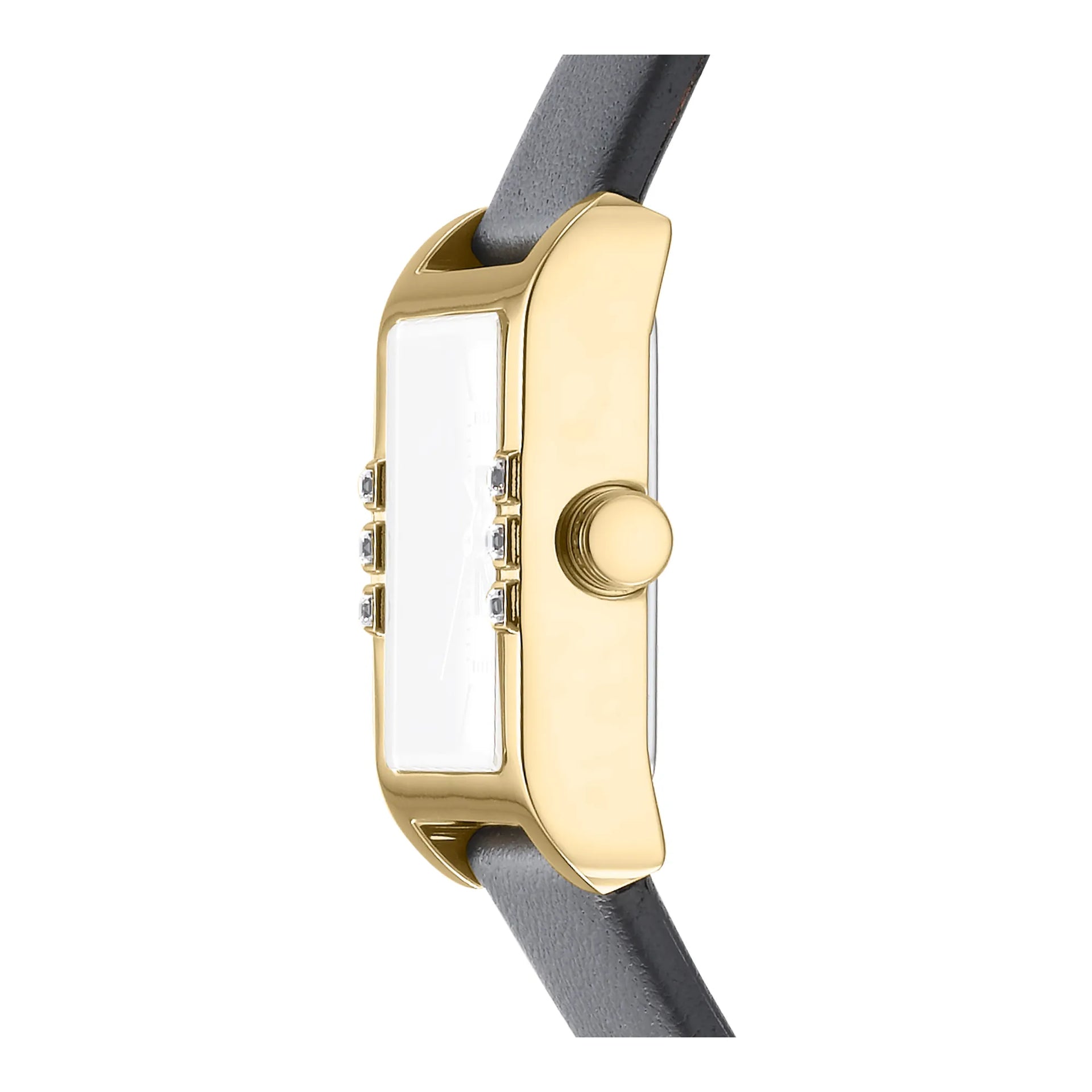 Nel cuore dell'eleganza urbana, dove la moda incontra la funzionalità, emerge un orologio che incarna lo spirito della sofisticazione moderna. Il DKNY DK1L008 Westside Glitz è una testimonianza dell'arte dell'orologeria, realizzato con precisione e stile per la donna contemporanea. La sua cassa rettangolare, immersa in una lussuosa tonalità di oro giallo, cattura l'essenza del glamour senza tempo, mentre il diametro elegante di 22 mm garantisce una presenza delicata ma d'impatto al polso. Il quadrante grigio-argento, una tela di sobria eleganza, è adornato da tre lancette che scivolano senza sforzo, alimentate da un affidabile movimento al quarzo. Questo orologio non è solo un accessorio, è una dichiarazione di gusto raffinato e chic urbano. Il cristallo minerale offre una vista chiara del quadrante, protetto da una corona a tirare e spingere che aggiunge un tocco di praticità al suo design. Il cinturino in pelle grigio topo, fissato con una fibbia ad ardiglione, avvolge comodamente il polso, offrendo un contrasto sottile con la cassa dorata. Resistente all'acqua, questo orologio è pronto ad accompagnarti nel trambusto della vita cittadina, senza compromettere lo stile. Il DKNY Westside Glitz è più di un orologio, è una celebrazione del pensiero all'avanguardia nella moda, un pezzo che risuona con chi apprezza le cose più raffinate della vita.