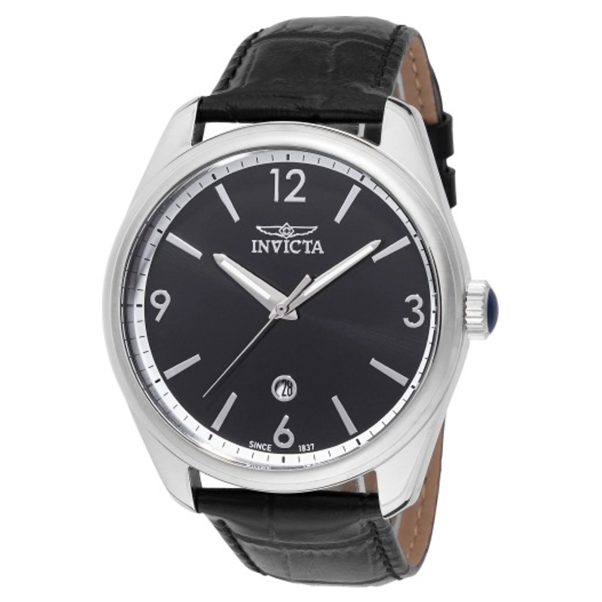 Designed for adventure and daily wear, this Invicta timepiece boasts an impressive 100-meter water resistance (WR 100mt), making it suitable for swimming and showering. A luxurious black leather strap, 22mm wide and 18cm long, secures the watch comfortably with a classic tang buckle, complementing the black dial and silver grey case beautifully. With a case thickness of 12mm and a weight of just 65g, it's designed for comfort.