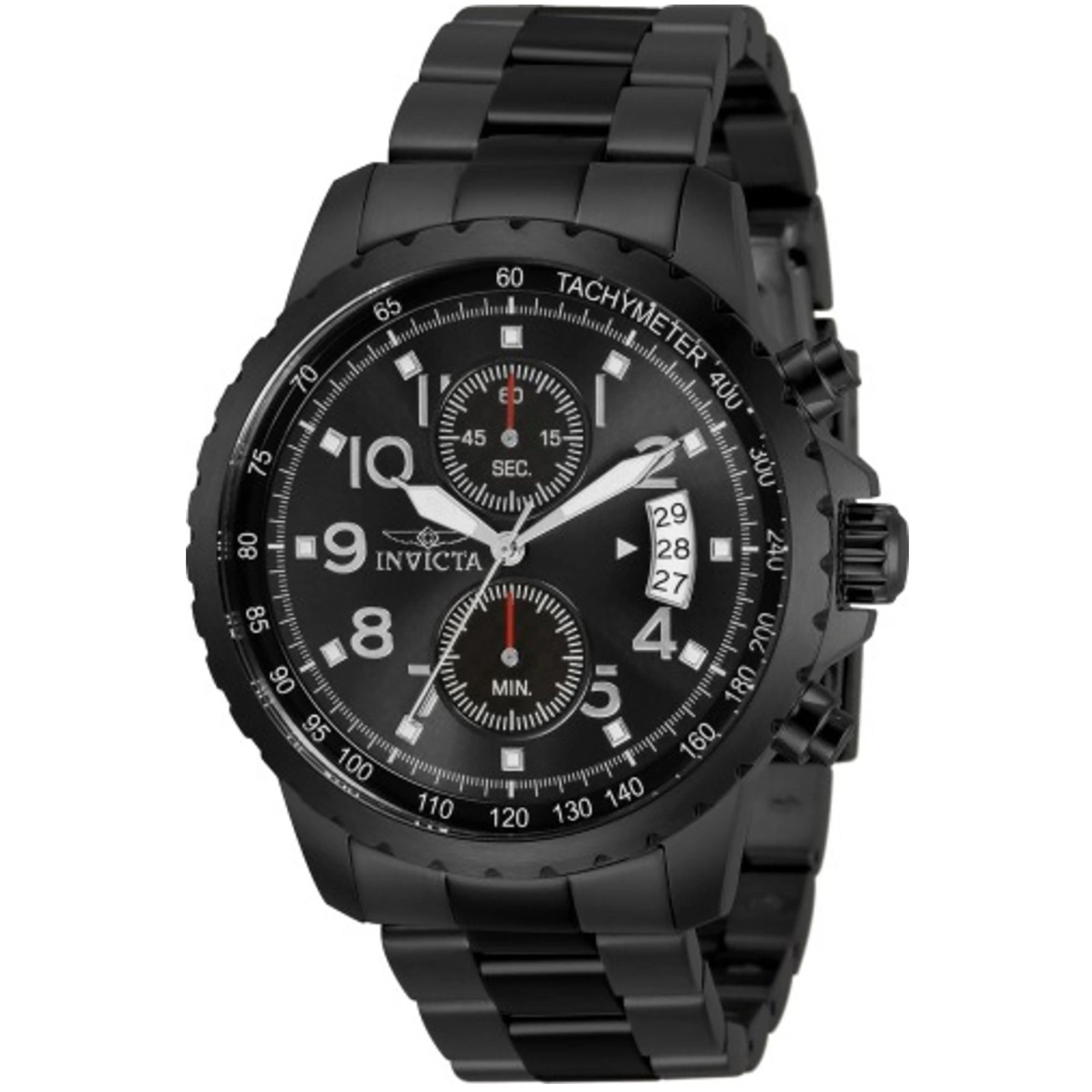 Powered by a precise SEIKO VD51 Quartz movement, this Invicta chronograph ensures accurate timekeeping and includes a convenient date display and stopwatch function. The generous 45mm round case, crafted from durable black stainless steel, provides a bold presence on the wrist, complemented by a comfortable 22mm black stainless steel band with a secure folding deployant clasp and safety lock.