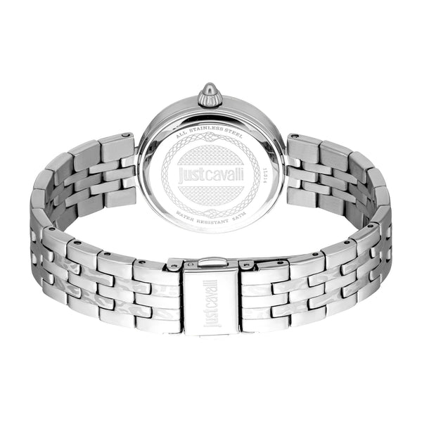 Il Just Cavalli Preziosa incanta con la sua cassa grigio-argento e quadrante blu notte, una miscela sofisticata di eleganza e stile. Il cinturino in acciaio inossidabile e la chiusura deployante a farfalla garantiscono una vestibilità perfetta, rendendolo un pezzo senza tempo per la donna esigente.