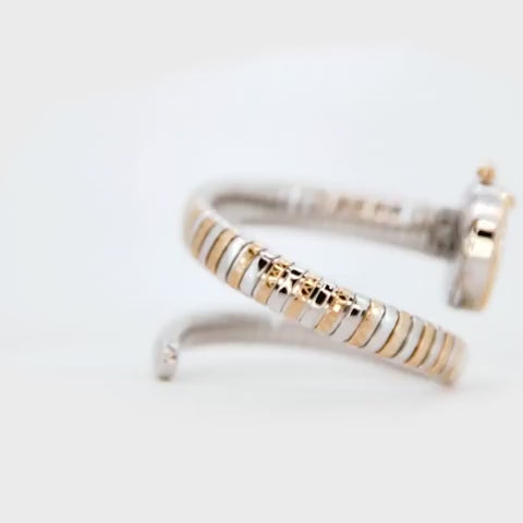 The Sirena watch features a striking 22mm round stainless steel case, exquisitely plated with a silver-grey and yellow-gold IP finish, echoing the luxurious snake motif. Its slim 7mm profile offers comfort and sophistication, while the durable mineral crystal protects a mesmerizing silver-grey dial. Adorned with 60 dazzling Zircons, the dial adds a brilliant sparkle, ensuring you stand out.