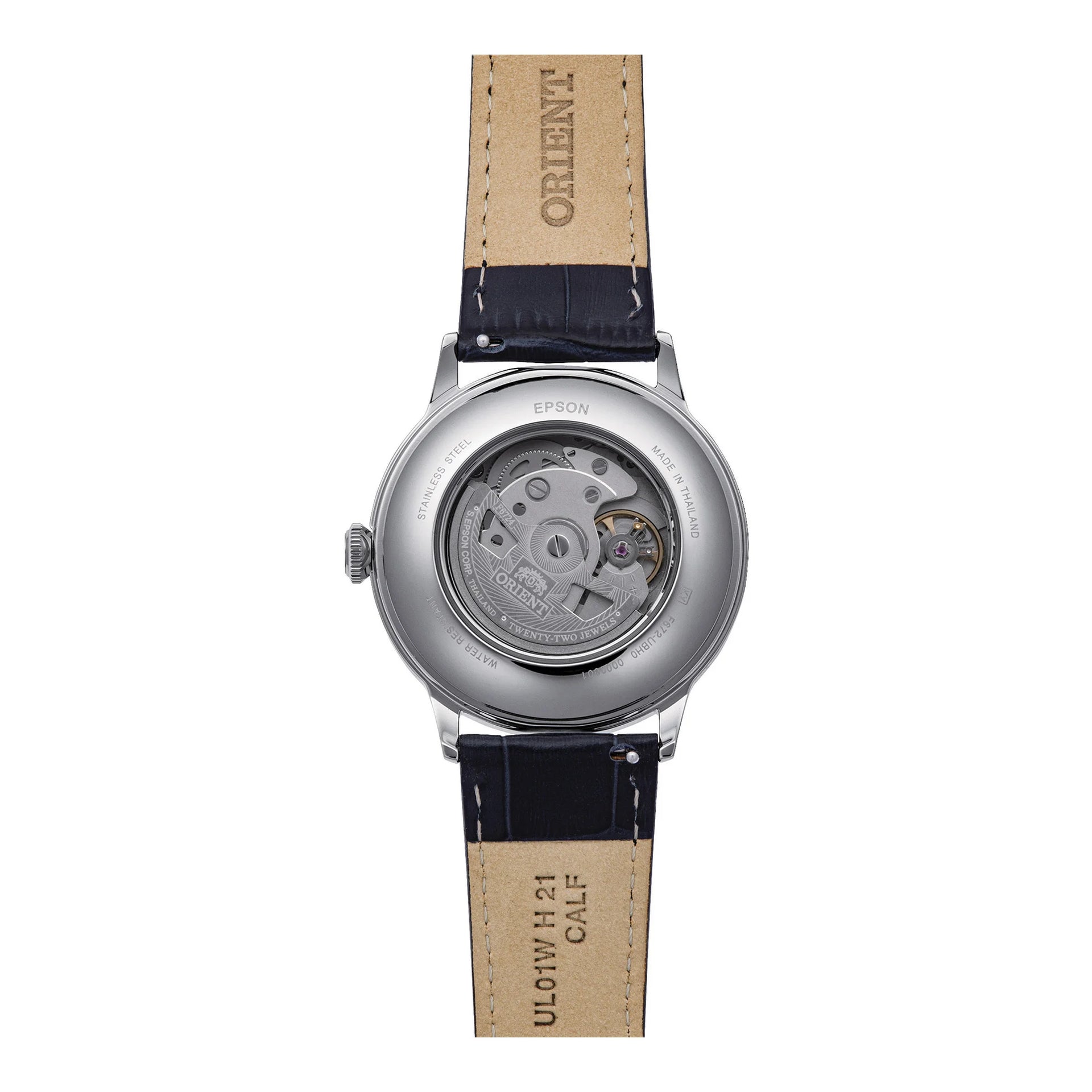 Nel regno dell'eleganza senza tempo, l'ORIENT AC00 Bambino Classic emerge come un faro di sofisticazione e precisione. Realizzato con meticolosa attenzione ai dettagli, questo orologio incarna l'essenza dello stile classico, rendendolo un accessorio indispensabile per il gentiluomo esigente. La cassa rotonda, immersa in una raffinata tonalità grigio argento, incornicia un affascinante quadrante blu notte che riecheggia le profondità di un cielo sereno serale. Questa armoniosa palette di colori si estende al cinturino in pelle, anch'esso blu notte, che avvolge comodamente il polso, fissato da una tradizionale fibbia ad ardiglione. Il cristallo minerale offre una vista chiara del quadrante, dove tre lancette scivolano con grazia, alimentate dal movimento meccanico del calibro F6724. Con 22 rubini che garantiscono un funzionamento fluido, questo orologio promette una precisione giornaliera di +25/-15 secondi, testimonianza della sua ingegneria di precisione. Il fondello trasparente rivela la danza intricata dei suoi meccanismi automatici e a carica manuale, una caratteristica che catturerà gli appassionati di orologeria. Resistente all'acqua e dotato di corona a estrazione e spinta, questo orologio è tanto pratico quanto elegante. Il calendario della data aggiunge un tocco di funzionalità, integrato perfettamente nel design. L'ORIENT AC00 Bambino Classic non è solo un orologio, è una dichiarazione di gusto raffinato e fascino senza tempo, perfetto per chi apprezza l'arte dell'orologeria.