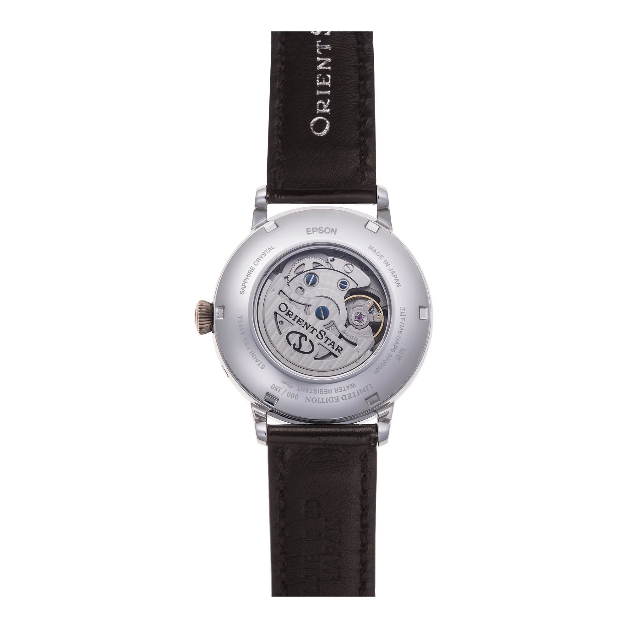 At its heart beats the in-house ORIENT F7M62 automatic and hand-wound movement, manufactured by SEIKO EPSON CORPORATION. This robust caliber features 22 jewels, a convenient hacking function, a prominent power reserve indicator, and a precise daily accuracy of +25/-15 seconds. Admire the intricate mechanics through the screw-down transparent case back, a true testament to Japanese engineering. The captivating moon phase complication and date display add a touch of celestial beauty and practicality to the rich chocolate brown dial.