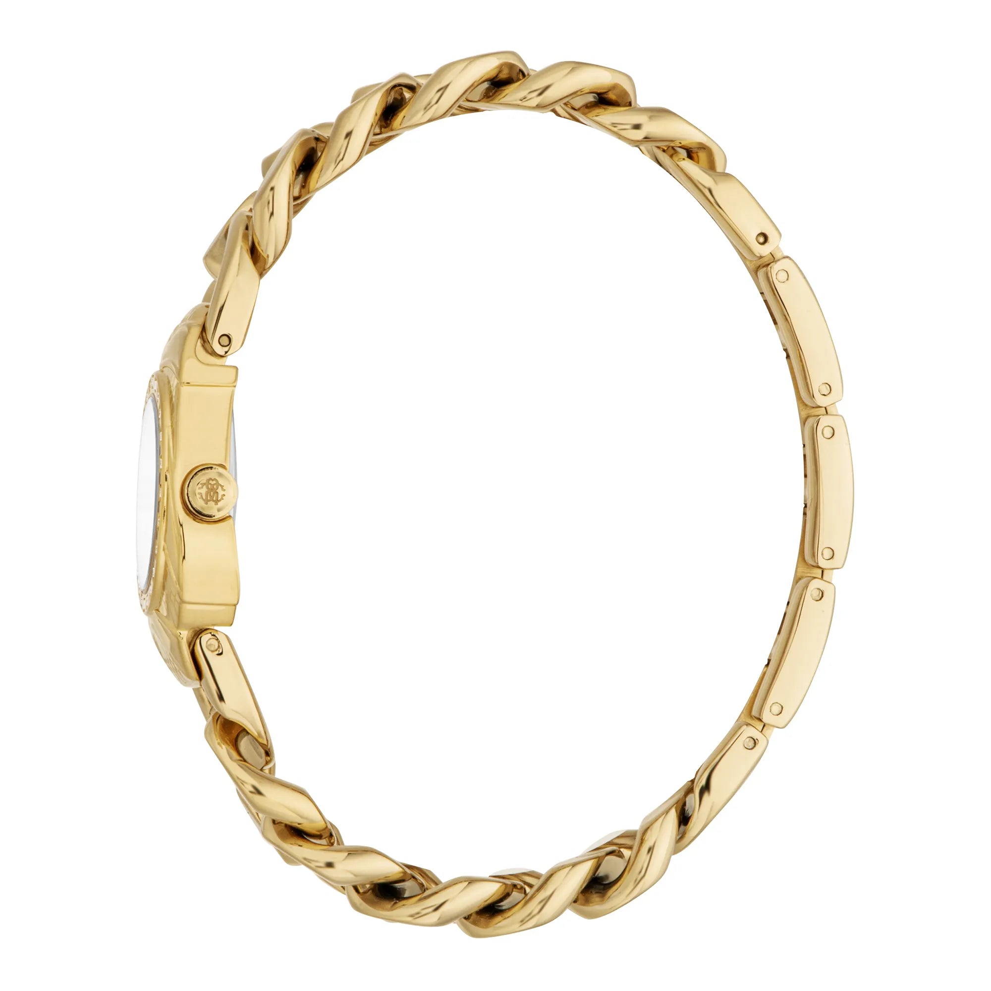 Nel mondo dell'alta orologeria, dove l'eleganza incontra l'innovazione, emerge un orologio che cattura l'essenza della sofisticazione e dello stile. Realizzato nel cuore dell'orologeria svizzera, questo orologio Roberto Cavalli Lady è una testimonianza di design raffinato e artigianato squisito. La sua forma irregolare della cassa, immersa nell'opulenza dell'oro giallo, emana un senso di lusso che è allo stesso tempo audace e senza tempo. Il cinturino in acciaio inossidabile, anch'esso in una tonalità di oro giallo abbinata, avvolge il polso con una grazia senza soluzione di continuità, fissato da una chiusura gioiello che riflette la sensibilità alla moda dell'orologio. Il quadrante bianco oyster, una tela di purezza ed eleganza, è adornato da due lancette che scivolano senza sforzo, alimentate da un preciso movimento al quarzo con calibro GL22. Questo orologio non è solo un misuratore del tempo ma una dichiarazione di stile, progettato per la donna moderna che apprezza le cose più raffinate della vita. Con una resistenza all'acqua fino a 50 metri, è tanto pratico quanto bello, pronto ad accompagnare chi lo indossa dalla sala riunioni a una serata in città. Il cristallo minerale aggiunge uno strato di durabilità, garantendo che questo pezzo squisito rimanga un accessorio prezioso per gli anni a venire. In ogni dettaglio, dalla corona a pressione al brillante finitura in oro giallo, questo orologio incarna lo spirito di Roberto Cavalli—dove la moda incontra la funzione in una danza di eleganza e fascino.