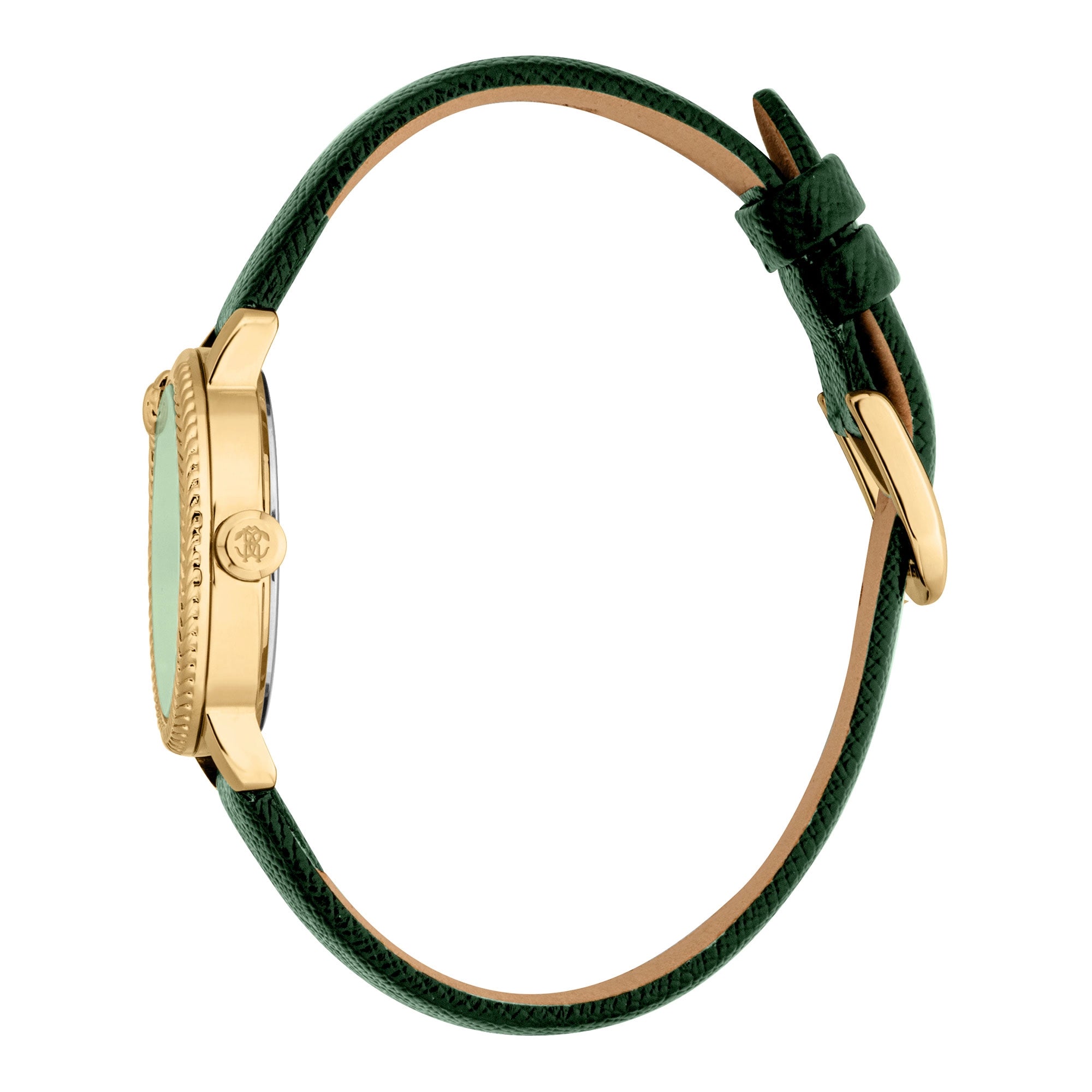 Discover the timeless elegance of Roberto Cavalli. Shop this stunning yellow gold and bottle green watch now at Watchello.com and find your perfect women's watch today!