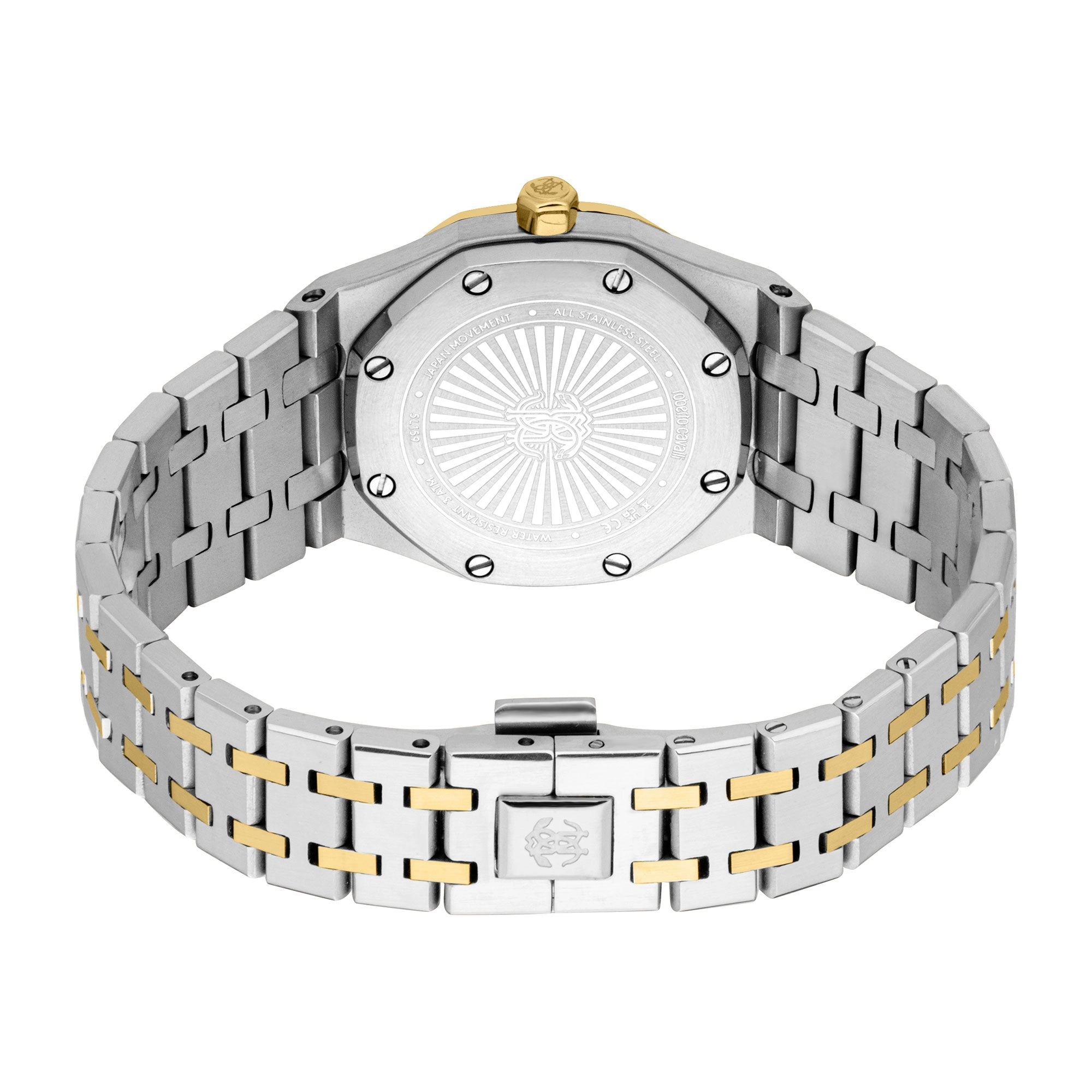 Designed for both elegance and practicality, the 21mm wide stainless steel band ensures a comfortable fit with its secure folding deployant clasp with push-button. With its water-resistant construction, this Roberto Cavalli watch is perfect for everyday wear, effortlessly transitioning from day to evening.