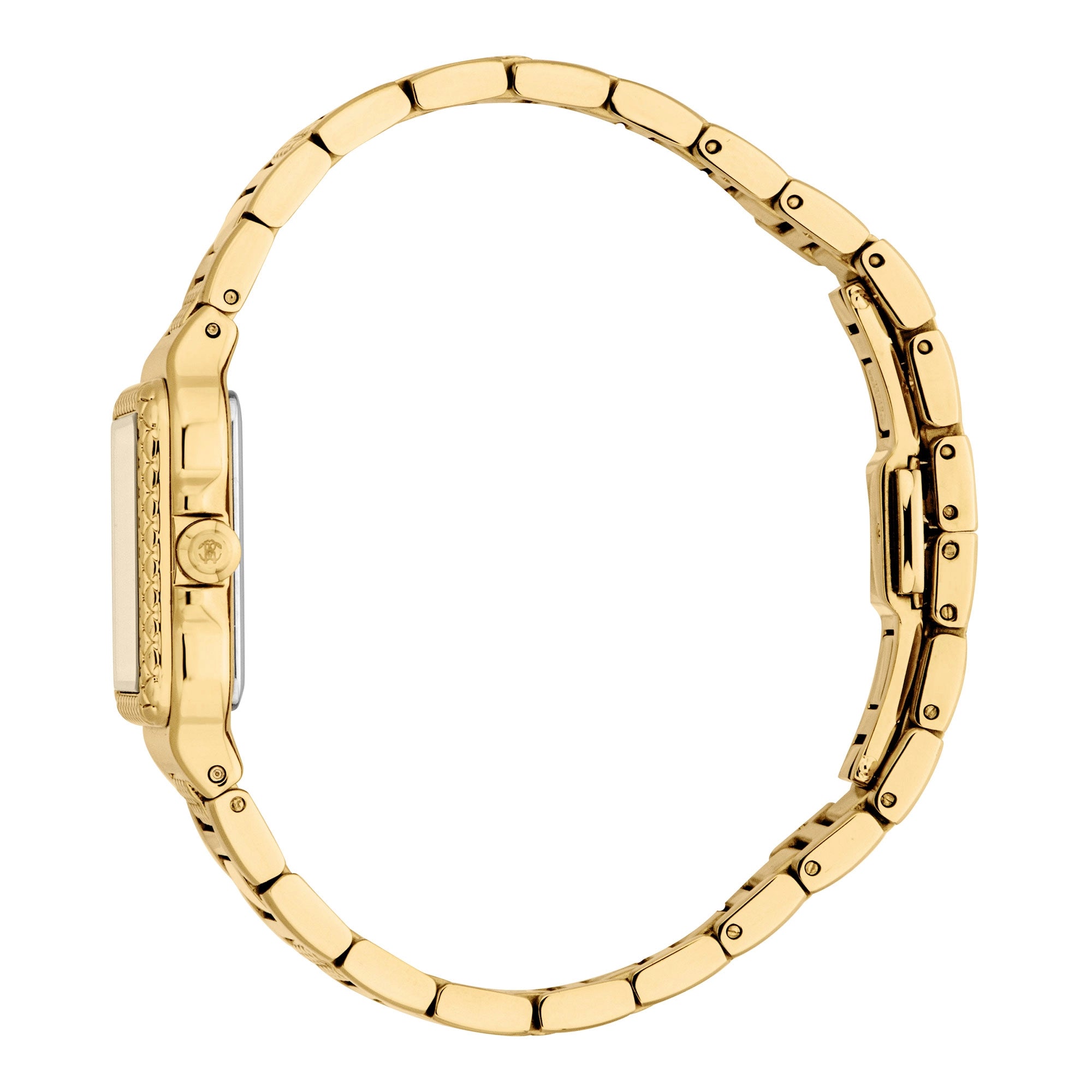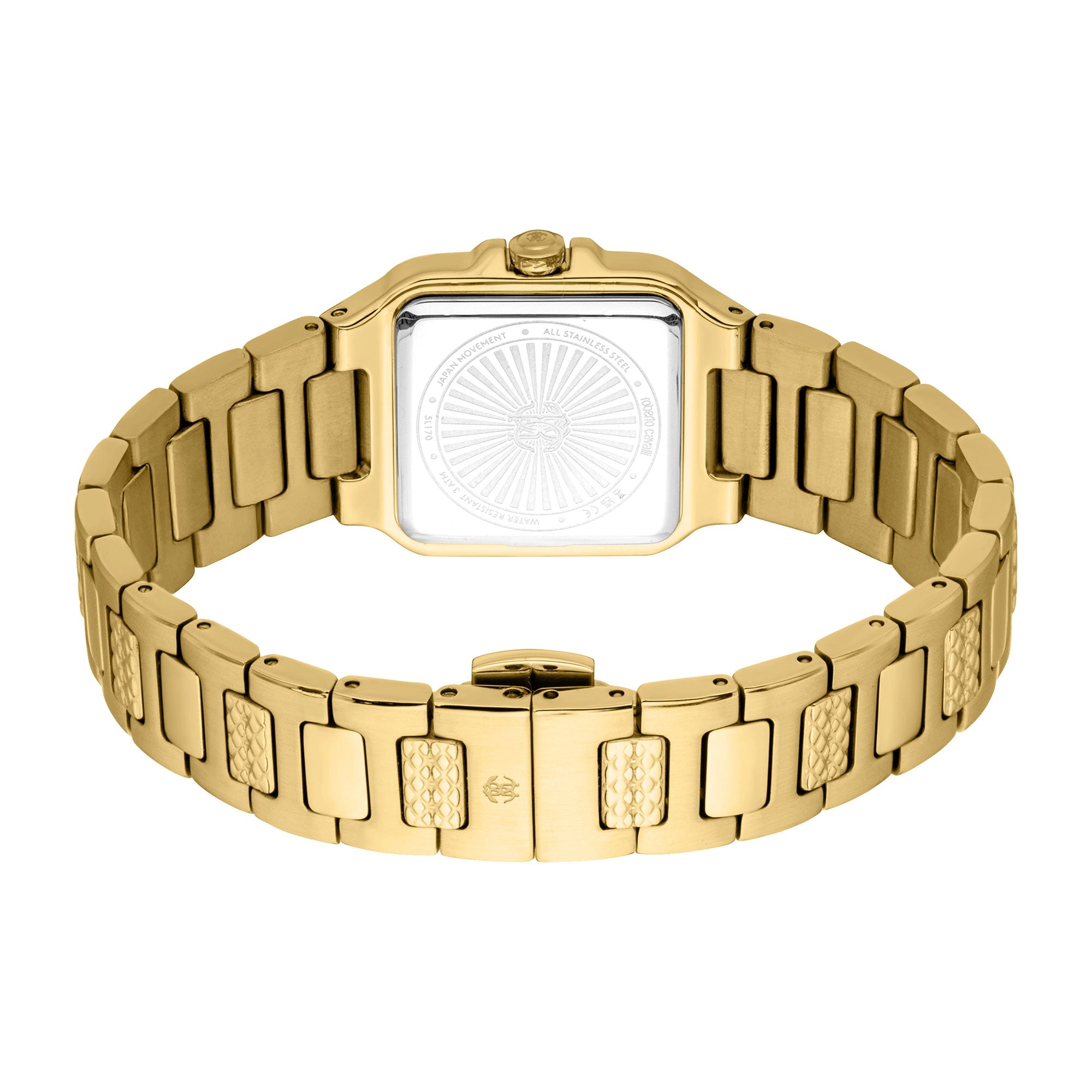 This Roberto Cavalli women's watch features a distinctive squared case crafted from premium stainless steel, adorned with a radiant yellow gold IP plating that exudes opulence. Its slender 8mm thickness ensures a comfortable fit, while the durable mineral crystal protects the elegant champagne dial. The dial, paired with a reliable 3-hand Quartz CITIZEN GL34 movement, offers precise timekeeping, making it as functional as it is beautiful.